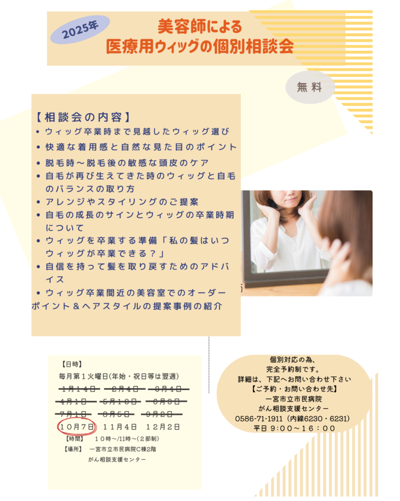 次回10月7日(火)一宮市立市民病院での医療用ウィッグ個別相談会